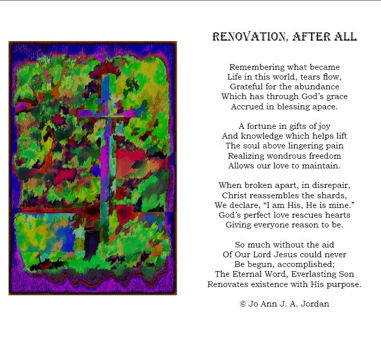 Picture and Poem Jo Ann J. A. Jordan Affirmation, Art, Beauty, Belief, Creative Poetry, Creativity, Faith, Gratitude, Language, Life, Love, Photography, Poetry, Reflection, Words, writing September 10, 2021September 10, 2021 Share this: Click to email a link to a friend (Opens in new window) Email Tweet Click to print (Opens in new window) Print Click to share on Reddit (Opens in new window) Reddit Like Loading... Related Published September 10, 2021September 10, 2021