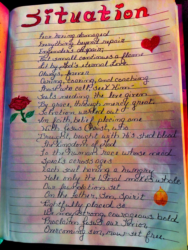 I wrote these with a fountain pen, which is not my best instrument. These are my journal pages. If you read them, you will get insight into where and what my state of mind is.